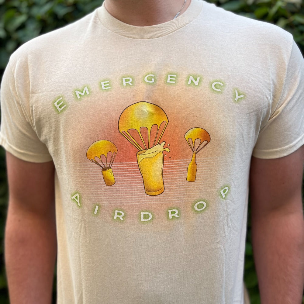 Heavy Cotton T-Shirt with printed EMERGENCY AIRDROP beer design.