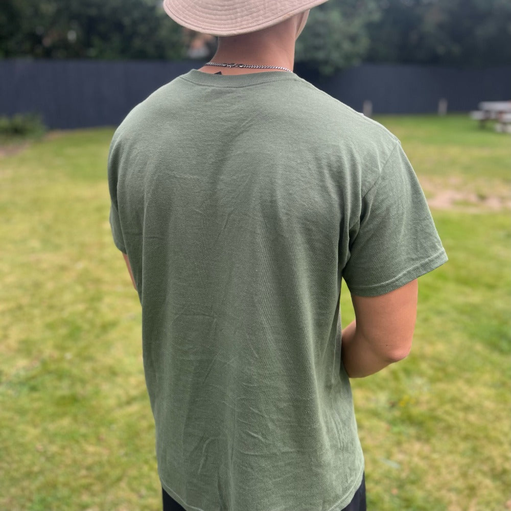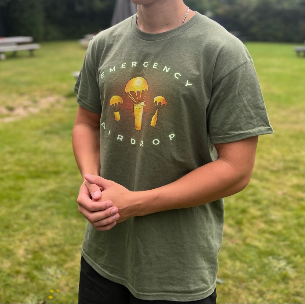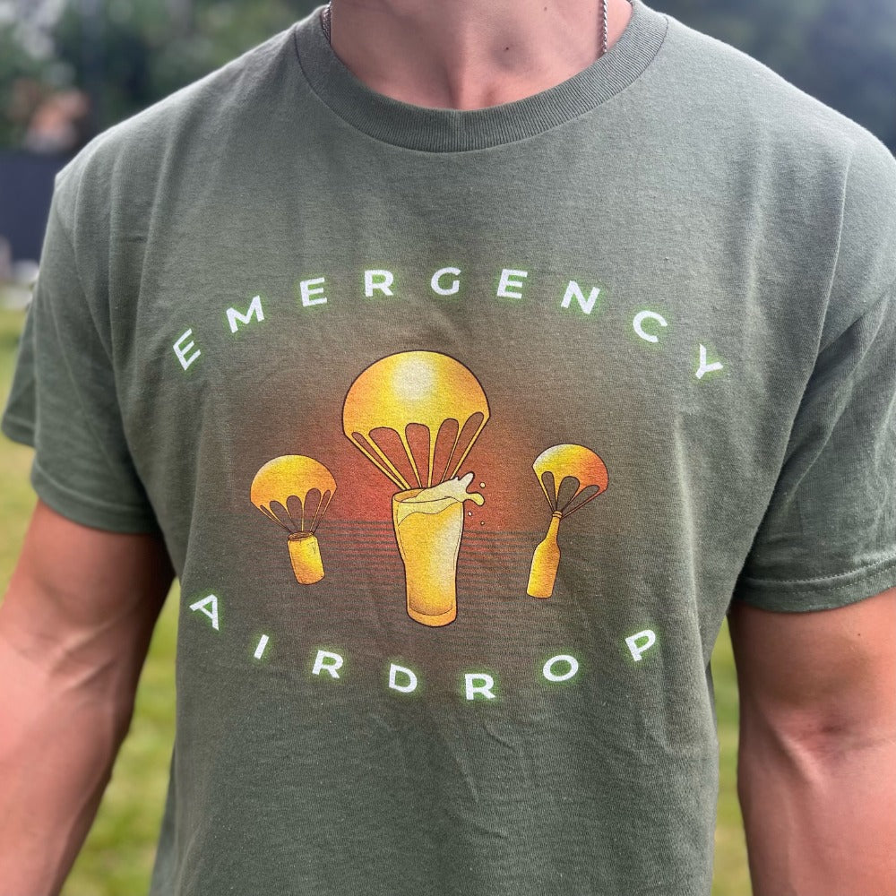 Heavy Cotton T-Shirt with printed EMERGENCY AIRDROP beer design.